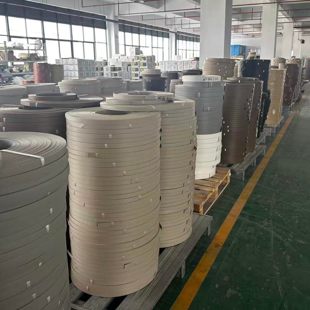 This high-performance edge banding strip is specially designed for panel furniture, cabinets, wardrobes and office furniture. It can perfectly wrap the cutting edges of panels, protecting the base material and giving the furniture a seamless aesthetic effect. The product is made of high-quality PVC/ABS raw materials, which is environmentally friendly, odorless, and in line with international standards. The production workshop has no odor and is suitable for aldehyde-free projects. The back is treated with a special rough embossing and hot-melt adhesive is used to bond it firmly to particleboard, density board and other boards, making it difficult to peel off the edges; an anti-scratch layer is added to the surface, which is wear-resistant and scratch-resistant. It can withstand scratches from hard objects such as keys in daily use. At the same time, the dense material is effectively moisture-proof and waterproof, preventing moisture penetration, preventing the edges of the board from swelling and molding, and significantly extending the life of the furniture. The edge banding strip has good flexibility and can smoothly pass through the fully automatic straight or curved edge banding machine. Even R-shaped or special-shaped edges can still fit tightly. In terms of technical specifications, the thickness is optional from 0.4mm to 22mm, the width is 10-100mm (regular 19/22/40mm), the length can be provided in 100m/200m rolls, and the surface treatment covers high gloss, matte, skin texture, wood grain, and solid color. Applicable scenarios include customized wardrobes, cabinets, bookcases, office desks, conference tables, display cabinets, indoor door covers and window cover decorative lines. It is especially suitable for places with high environmental protection requirements such as kindergartens and hospitals. Processing suggestions: The hot melt glue temperature of the automatic edge banding machine is controlled at 180-220°C; manual operation can be used with L-shaped glue or glue-free products. After cutting, use a trimming knife or chamfering machine to obtain rounded corners. Supports customization of exclusive colors, wood grains and even logo printing on demand (minimum order quantity required). Whether it is purchased in bulk from a furniture factory or used in a customized furniture store, this edge banding strip can help you improve the durability and beauty of the edge details of your product with stable quality and rich choices.